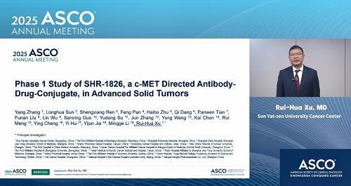 2025年美国临床肿瘤学会(ASCO)年会于5月30日至6月3日在美国芝加哥举行。本次大会,由中山大学肿瘤防治中心徐瑞华教授牵头、永利娱乐城自主研发的靶向细胞间质上皮转换因子(c-MET)ADC药物SHR-1826的一项I期临床研究入选临床科学研讨会,并由徐瑞华教授口头报告了该研究结果。该研究由43家国内中心共同完成。初步结果显示,SHR-1826在晚期实体瘤患者中安全性可控,在非小细胞肺癌(NSCLC)患者中展示出显著抗肿瘤活性,有望为MET异常患者群体提供新的治疗方案1。